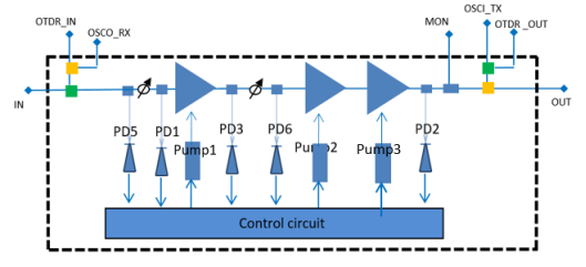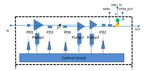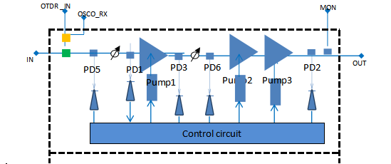 This document specifies the requirements of a DWDM C-band amplifier. The amplifier modules include one gain unit which can be operated at constant gain (Automatic Gain Control AGC) or constant output power (Automatic Power Control, APC). There are isolators at input and output port. Integrated VOA can be closed control for accurate attenuation, in order to achieve smooth gain spectrum for different target gain.