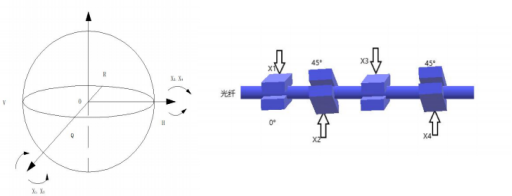 偏振控制器模块采用模拟输入控制和数字输入控制,同时只能采用一种控制方式,偏振控制器模块原理采用四路压电陶瓷挤压光纤,利用光纤的双折射效应进行偏 振控制,其中挤压光纤通过下图两两成 45°的挤压结构进行。单路挤压可以产生>4π相移,依次控制四路挤压电压,可以产生任意偏振态的光。